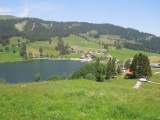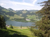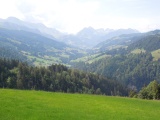 Vue en diection du Lac Noir depuis Martenen, avec le col d'Euschels laissant apercevoir une partie des Gastlosen