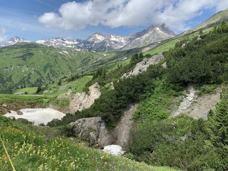 Photo 2 / 2 : Dolines au Unterer Kriegersattel, avec derrière de gauche à droite: Rote Wand, Johannesköpfe, Hochlichtspitze et Braunarlspitze
