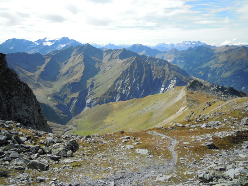 Photo 2 / 3 : La haute vallée de Lavtina vue de Lavtinasattel, à gauche à l'arrière-plan les Piz Dolf, Segnas et Sardona